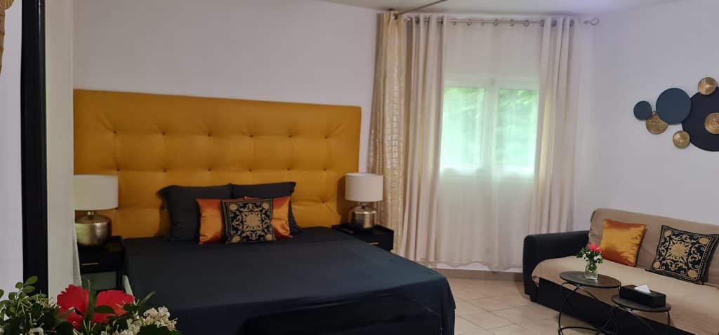 La Goldy Room vous accueille dans un univers de confort et de luxe. Son total look noir est orné de touches dorées et d’éléments raffinés comme sa tête de lit capitonnée, faite mains. Cette chambre spacieuse combine design moderne et élégance. Elle est idéale pour les familles ou les voyageurs en quête de détente, loin de l’agitation urbaine. Profitez d’une literie de qualité avec un lit king-size ou deux lits simples, accompagné d’un canapé-lit pour les invités supplémentaires. Les draps et serviettes, ainsi que les produits d’accueil tels que bouteilles d’eau et dosettes Dolce Gusto, ajoutent une touche de luxe à votre séjour.